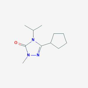 3-Cyclopentyl-1-methyl-4-(propan-2-yl)-4,5-dihydro-1H-1,2,4-triazol-5-one is a derivative of the 4,5-dihydro-1H-1,2,4-triazol-5-one scaffold, a heterocyclic system known for its broad biological activities, including antimicrobial, antioxidant, and antitumor properties . This compound features a cyclopentyl group at position 3, a methyl group at position 1, and an isopropyl substituent at position 2. These substituents influence its physicochemical properties, such as acidity and lipophilicity, which are critical for its biological interactions.