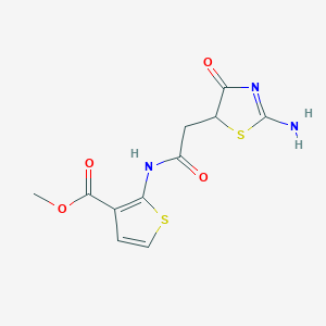 The synthesis of Methyl 2-(2-(2-imino-4-oxothiazolidin-5-yl)acetamido)thiophene-3-carboxylate typically involves multi-step organic reactions. One common method includes the condensation of a thiophene derivative with a thiazolidine precursor under controlled conditions. The reaction often requires the use of catalysts and specific solvents to achieve high yields and purity.