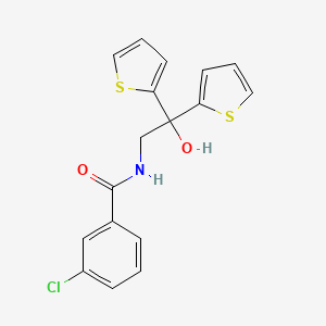 The mechanism of action of 3-chloro-N-(2-hydroxy-2,2-di(thiophen-2-yl)ethyl)benzamide involves its interaction with specific molecular targets. For instance, it may inhibit certain enzymes by binding to their active sites, thereby blocking substrate access. The thiophene rings can also participate in π-π interactions with aromatic residues in proteins, enhancing binding affinity.