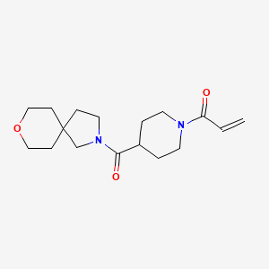 1-(4-{8-Oxa-2-azaspiro[4.5]decane-2-carbonyl}piperidin-1-yl)prop-2-en-1-one is a complex organic compound featuring a spirocyclic structure. This compound is notable for its potential applications in various fields, including medicinal chemistry and materials science. The unique structural elements of this compound, such as the spirocyclic core and the presence of both oxygen and nitrogen heteroatoms, contribute to its distinctive chemical properties and reactivity.