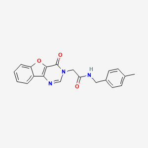 N-(4-methylbenzyl)-2-(4-oxobenzofuro[3,2-d]pyrimidin-3(4H)-yl)acetamide is a synthetic small molecule featuring a benzofuropyrimidinone core linked to a 4-methylbenzyl-substituted acetamide moiety. This scaffold combines a fused benzofuran-pyrimidinone heterocyclic system, which is structurally analogous to quinazolinones and thienopyrimidinones. While specific data on this compound’s synthesis or activity are absent in the provided evidence, its structural features align with derivatives reported in the literature for antimicrobial, anticancer, and enzyme inhibition applications .