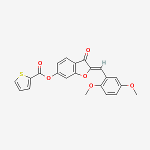 The compound “(Z)-2-(2,5-dimethoxybenzylidene)-3-oxo-2,3-dihydrobenzofuran-6-yl thiophene-2-carboxylate” belongs to the aurone family, a class of bioactive molecules characterized by a benzofuran-3(2H)-one core modified with a benzylidene substituent at the C2 position and an ester group at C6. This specific derivative features a 2,5-dimethoxybenzylidene moiety and a thiophene-2-carboxylate ester, distinguishing it from analogs with alternative substituents (e.g., methanesulfonate, cyclohexanecarboxylate, or acetonitrile groups) . Aurones are notable for their anticancer properties, particularly as tubulin polymerization inhibitors targeting the colchicine-binding site .