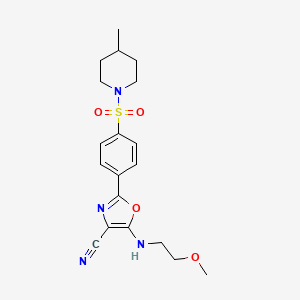 This compound is a 1,3-oxazole-4-carbonitrile derivative featuring a (2-methoxyethyl)amino substituent at position 5 and a 4-[(4-methylpiperidin-1-yl)sulfonyl]phenyl group at position 2.