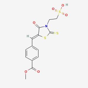 (Z)-2-(5-(4-(methoxycarbonyl)benzylidene)-4-oxo-2-thioxothiazolidin-3-yl)ethanesulfonic acid is a thiazolidinone derivative that has garnered attention for its potential biological activities, particularly in the fields of antimicrobial, anticancer, and anti-inflammatory research. This compound belongs to a class of molecules known for their diverse pharmacological properties, including their ability to inhibit various enzymes and modulate cellular signaling pathways.
