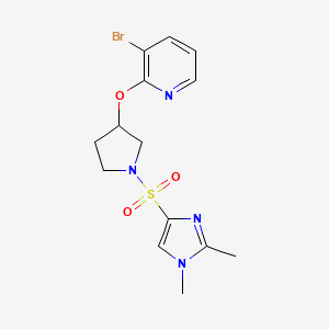 The synthesis of 3-bromo-2-((1-((1,2-dimethyl-1H-imidazol-4-yl)sulfonyl)pyrrolidin-3-yl)oxy)pyridine typically involves multiple steps, starting with the preparation of the imidazole core. One common approach is the reaction of 1,2-dimethyl-1H-imidazole with a suitable sulfonyl chloride to introduce the sulfonyl group