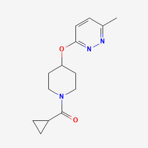 The mechanism of action of 3-[(1-cyclopropanecarbonylpiperidin-4-yl)oxy]-6-methylpyridazine involves its interaction with specific molecular targets and pathways. The compound can bind to enzymes, receptors, or other proteins, modulating their activity and leading to various biological effects. The exact pathways and targets depend on the specific application and the context in which the compound is used .