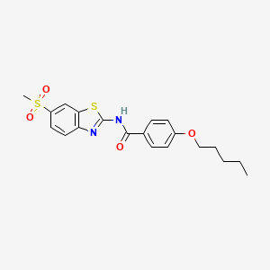 This compound features a methylsulfonyl group attached to a benzothiazole moiety, along with a pentyloxy substituent on the benzamide portion. These structural components are significant as they contribute to the compound's biological properties.