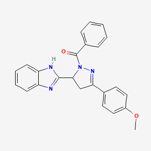This compound features a pyrazoline core substituted with a benzoyl group at position 1, a 4-methoxyphenyl group at position 3, and a 1H-1,3-benzodiazole moiety at position 2. The benzodiazole group is a fused aromatic heterocycle known for its electron-rich properties, which may enhance interactions with biological targets. Pyrazoline derivatives are widely studied for their pharmacological activities, including antimicrobial, anti-inflammatory, and enzyme-inhibitory properties .