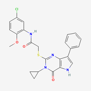 This compound is a pyrrolo[3,2-d]pyrimidine derivative characterized by a 4-oxo-4,5-dihydro-3H-pyrrolo[3,2-d]pyrimidin-2-yl scaffold substituted with a cyclopropyl group at position 3 and a phenyl ring at position 5. The thioacetamide side chain at position 2 is further functionalized with a 5-chloro-2-methoxyphenyl group. Its molecular formula is C₂₃H₂₀ClN₃O₂S, with a molecular weight of 438.94 g/mol (calculated from structural data). The compound’s design integrates features common to kinase inhibitors and enzyme modulators, such as a planar heterocyclic core for target binding and hydrophobic substituents (cyclopropyl, phenyl) for enhanced lipophilicity and membrane permeability .