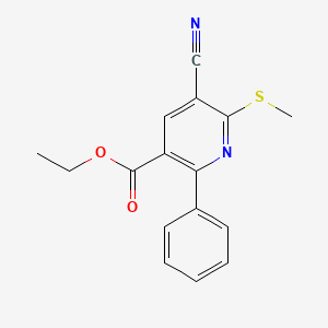 The synthesis of Ethyl 5-cyano-6-(methylsulfanyl)-2-phenylnicotinate typically involves the alkylation of 6-thioxo-1,4,5,6-tetrahydropyridine-3-carboxylate with alkyl halides. The reaction proceeds under mild conditions, with alkylation occurring exclusively at the sulfur atom . The reaction conditions often involve the use of solvents such as ethanol and catalysts like triethylamine to facilitate the reaction .