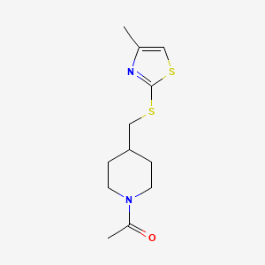 1-(4-(((4-Methylthiazol-2-yl)thio)methyl)piperidin-1-yl)ethanone is a compound of significant interest in medicinal chemistry due to its unique structural properties and potential biological activities. This article delves into its biological activity, including mechanisms of action, therapeutic applications, and relevant research findings.