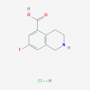The compound features a tetrahydroisoquinoline scaffold with a fluorine substituent at position 7 and a carboxylic acid group at position 5, forming a hydrochloride salt. Synthesis typically involves cyclization of substituted benzylamines followed by fluorination and carboxylation. For example, a multi-step approach may include: