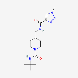 N-(tert-butyl)-4-((1-methyl-1H-1,2,3-triazole-4-carboxamido)methyl)piperidine-1-carboxamide is a synthetic small molecule characterized by a piperidine core substituted with a tert-butyl carboxamide group and a methyltriazole-carboxamido methyl side chain. Its synthesis typically involves multi-step protocols, including coupling reactions and cyclization processes, as exemplified in related piperidine-triazole derivatives . Key characterization techniques such as $^{1}\text{H}$-, $^{13}\text{C}$-, and $^{15}\text{N}$-NMR, alongside high-resolution mass spectrometry (HRMS), are critical for confirming its structural integrity .