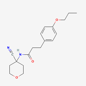 N-(4-Cyanooxan-4-YL)-3-(4-propoxyphenyl)propanamide is a synthetic propanamide derivative characterized by a 4-propoxyphenyl substituent at the 3-position of the propanamide backbone and a 4-cyanooxan-4-yl group attached to the nitrogen atom. The 4-cyanooxan-4-yl moiety consists of a tetrahydropyran ring with a cyano group at the 4-position, contributing to both steric bulk and electronic effects. While direct data on this compound’s synthesis or applications are absent in the provided evidence, its structural features suggest utility in pharmaceutical or materials science research, particularly in targeting enzymes or receptors where hydrophobic interactions and hydrogen bonding (via the cyano group) are critical .