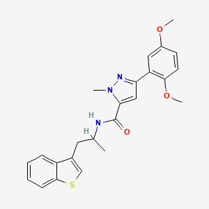 N-(1-(Benzo[b]thiophen-3-yl)propan-2-yl)-3-(2,5-dimethoxyphenyl)-1-methyl-1H-pyrazole-5-carboxamide is a pyrazole-based carboxamide derivative with a complex heterocyclic structure. Its core pyrazole scaffold is substituted at the 1-position with a methyl group, at the 3-position with a 2,5-dimethoxyphenyl moiety, and at the 5-position with a carboxamide linker. The carboxamide side chain incorporates a benzo[b]thiophene ring system, a sulfur-containing aromatic heterocycle known for enhancing pharmacokinetic properties such as metabolic stability and lipophilicity .
