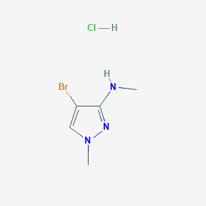 The mechanism of action of 4-Bromo-N,1-dimethylpyrazol-3-amine;hydrochloride involves its interaction with specific molecular targets. The bromine atom and dimethylamino group play crucial roles in its reactivity and binding affinity. The compound can interact with enzymes and receptors, modulating their activity and leading to various biological effects. The exact pathways and molecular targets are still under investigation, but it is believed to involve interactions with nucleophilic sites in biological molecules .