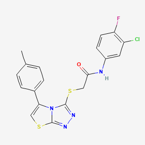 N-(3-chloro-4-fluorophenyl)-2-{[5-(4-methylphenyl)-[1,2,4]triazolo[3,4-b][1,3]thiazol-3-yl]sulfanyl}acetamide is a heterocyclic compound featuring a triazolo[3,4-b][1,3]thiazole core fused with a 4-methylphenyl substituent at position 5 and a sulfanylacetamide side chain linked to a 3-chloro-4-fluorophenyl group. This structural architecture is associated with diverse biological activities, including antimicrobial, anti-inflammatory, and herbicidal properties, as observed in related triazolothiadiazole and triazolothiazole derivatives .