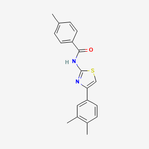 The synthesis of N-[4-(3,4-dimethylphenyl)-1,3-thiazol-2-yl]-4-methylbenzamide typically involves the formation of the thiazole ring followed by the introduction of the benzamide group. One common method involves the reaction of 3,4-dimethylphenylamine with thioamide under acidic conditions to form the thiazole ring. This intermediate is then reacted with 4-methylbenzoyl chloride in the presence of a base such as triethylamine to yield the final product .