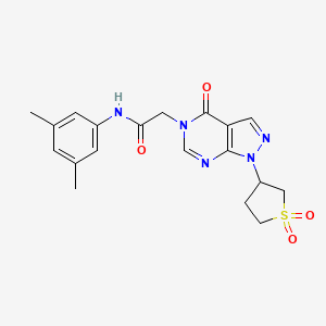N-(3,5-Dimethylphenyl)-2-(1-(1,1-dioxidotetrahydrothiophen-3-yl)-4-oxo-1H-pyrazolo[3,4-d]pyrimidin-5(4H)-yl)acetamide is a pyrazolo-pyrimidine acetamide derivative characterized by a fused bicyclic pyrazolo[3,4-d]pyrimidine core substituted with a 1,1-dioxidotetrahydrothiophen-3-yl group at position 1 and a 4-oxo moiety. The acetamide side chain is linked to a 3,5-dimethylphenyl group, contributing to its unique physicochemical and pharmacological profile. This compound is structurally analogous to radiolabeled ligands and kinase inhibitors but distinct in its sulfone-containing tetrahydrothiophene substituent, which may enhance solubility or target binding .