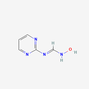 N'-Hydroxy-N-pyrimidin-2-yliminoformamide is a heterocyclic compound featuring a pyrimidine ring substituted with an iminoformamide group and a hydroxylamine moiety. The pyrimidine core is a common pharmacophore in drug design due to its ability to participate in hydrogen bonding and π-stacking interactions, which are critical for binding to biological targets such as enzymes or nucleic acids . The iminoformamide group introduces conformational rigidity, while the N'-hydroxy moiety may enhance solubility or serve as a reactive site for further functionalization.