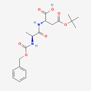(S)-2-((S)-2-(((Benzyloxy)carbonyl)amino)propanamido)-4-(tert-butoxy)-4-oxobutanoic acid is a chiral aspartic acid derivative characterized by two stereospecific (S)-configurations. Its structure includes a benzyloxycarbonyl (Cbz) group, a tert-butoxy ester, and a peptide backbone, making it a valuable intermediate in peptide synthesis . The Cbz group provides base-labile protection for amines, while the tert-butoxy ester enhances stability under acidic conditions, enabling selective deprotection strategies . This compound (CAS 229957-50-0, molecular formula C₁₆H₂₃NO₇) is commercially available and utilized in pharmaceutical research for constructing bioactive peptides .
