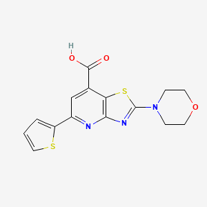 The synthesis of 2-Morpholino-5-(thiophen-2-yl)thiazolo[4,5-b]pyridine-7-carboxylic acid typically involves multicomponent reactions (MCRs), which are efficient one-pot processes that combine multiple substrates to form complex products. One common synthetic route involves the Ugi-Zhu three-component reaction, followed by a cascade aza-Diels-Alder cycloaddition, N-acylation, decarboxylation, and dehydration process . This method uses toluene as the solvent and ytterbium (III) triflate as the Lewis acid catalyst, with microwave-dielectric heating to enhance the overall yield and reduce reaction time .