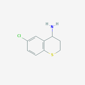 6-Chloro-3,4-dihydro-2H-1-benzothiopyran-4-amine is a heterocyclic organic compound featuring a benzothiopyran core, where sulfur replaces the oxygen atom found in traditional chromane structures. Its molecular formula is C₉H₁₀ClNS, with a chlorine substituent at position 6 and an amine group at position 4.