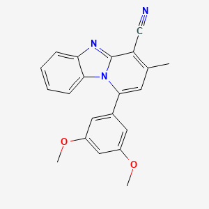 The synthesis of 1-(3,5-Dimethoxyphenyl)-3-methylpyrido[1,2-a]benzimidazole-4-carbonitrile involves several steps, starting with the preparation of the pyrido[1,2-a]benzimidazole core. One common method involves the condensation of o-phenylenediamine with a suitable aldehyde or ketone, followed by cyclization to form the benzimidazole ring.