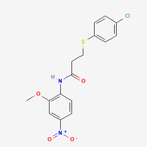 The synthesis of 3-[(4-chlorophenyl)sulfanyl]-N-(2-methoxy-4-nitrophenyl)propanamide typically involves the reaction of 4-chlorothiophenol with 2-methoxy-4-nitrobenzoyl chloride in the presence of a base such as triethylamine. The reaction proceeds through nucleophilic substitution, forming the desired product. The reaction conditions often include an inert atmosphere, such as nitrogen or argon, and a solvent like dichloromethane or tetrahydrofuran.