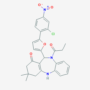 11-[5-(2-chloro-4-nitrophenyl)-2-furyl]-3,3-dimethyl-10-propionyl-2,3,4,5,10,11-hexahydro-1H-dibenzo[b,e][1,4]diazepin-1-one is a complex organic compound that features a unique combination of functional groups, including a furan ring, a nitrophenyl group, and a dibenzo[b,e][1,4]diazepin-1-one core