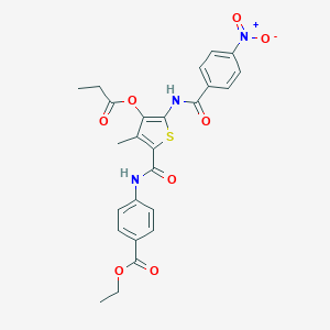 ETHYL 4-({[3-METHYL-5-[(4-NITROBENZOYL)AMINO]-4-(PROPIONYLOXY)-2-THIENYL]CARBONYL}AMINO)BENZOATE has several applications in scientific research: