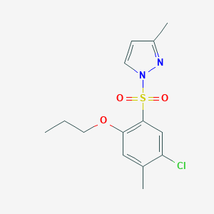 The mechanism by which 5-Chloro-4-methyl-1-[(3-methylpyrazolyl)sulfonyl]-2-propoxybenzene exerts its effects involves interactions with specific molecular targets. The sulfonyl group can form strong interactions with amino acid residues in proteins, potentially inhibiting enzyme activity or modulating receptor function. The chloro and propoxy groups may enhance the compound’s binding affinity and specificity.