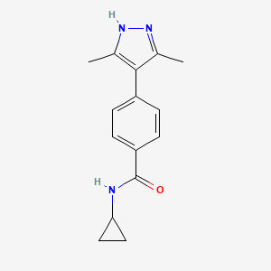The synthesis of N-cyclopropyl-4-(3,5-dimethyl-1H-pyrazol-4-yl)benzamide typically involves the formation of the pyrazole ring followed by the introduction of the benzamide moiety. One common method involves the cyclization of appropriate precursors under controlled conditions. For instance, the reaction of 3,5-dimethyl-1H-pyrazole with cyclopropylamine can be followed by the acylation of the resulting intermediate with 4-bromobenzoyl chloride .