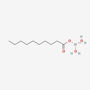Aluminum, (decanoato-O)dihydroxy- (CAS 123774-65-2) is an organoaluminum compound with the molecular formula C₁₀H₂₁AlO₄. Structurally, it consists of an aluminum center coordinated by two hydroxyl groups and one decanoate ligand (a 10-carbon fatty acid chain, CH₃(CH₂)₈COO⁻) . This compound belongs to the class of aluminum carboxylates, which are widely used in industrial applications such as polymer stabilizers, catalysts, and surfactants. Its amphiphilic nature, derived from the hydrophobic decanoate chain and hydrophilic aluminum-hydroxyl core, enables versatile interactions in materials science .