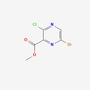 Methyl 6-bromo-3-chloropyrazine-2-carboxylate is a halogenated heterocyclic compound that serves as a key intermediate in the synthesis of a variety of more complex molecules. Its bifunctional nature, possessing both bromo and chloro substituents on the pyrazine ring, makes it a versatile building block in medicinal chemistry and agrochemical research. The strategic placement of these halogens allows for selective functionalization through various cross-coupling reactions, enabling the construction of diverse molecular scaffolds for the development of novel therapeutic agents and pesticides. This document provides a comprehensive overview of the known physical and chemical properties of this compound, along with a proposed synthetic pathway.