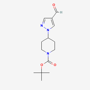 this compound is synthesized via multi-step reactions involving pyrazole-4-carboxaldehyde precursors. A key intermediate, pyrazole-4-carboxaldehyde, is often oxidized from hydroxymethylpyrazole derivatives using reagents like PCC (pyridinium chlorochromate) . The BOC (tert-butoxycarbonyl) group is introduced via protection of the piperidine nitrogen under anhydrous conditions, typically using di-tert-butyl dicarbonate (Boc₂O) in dichloromethane with a base like triethylamine . Characterization relies on NMR (¹H/¹³C), IR (to confirm aldehyde C=O stretch at ~1700 cm⁻¹), and mass spectrometry.