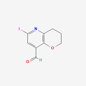 Synthetic Routes and Reaction Conditions: The synthesis of 6-Iodo-3,4-dihydro-2H-pyrano[3,2-b]pyridine-8-carbaldehyde typically involves the iodination of a pyrano[3,2-b]pyridine precursor. The reaction conditions often include the use of iodine and an oxidizing agent in an appropriate solvent . The reaction is carried out under controlled temperature and pH conditions to ensure the selective introduction of the iodine atom at the desired position.