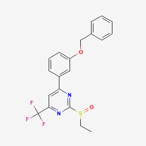 The synthesis of 4-(3-(benzyloxy)phenyl)-2-(ethylsulfinyl)-6-(trifluoromethyl)pyrimidine can be conceptualized as a three-stage process. The initial stage involves the construction of the core pyrimidine ring, which is then followed by the introduction of the ethylthio group, and finally, a selective oxidation to the ethylsulfinyl group.