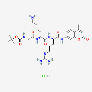 The mechanism of action of N-T-Boc-gly-lys-arg 7-amido-4-methylcoumarin hydrochloride involves its recognition and cleavage by specific proteases. The proteases bind to the peptide substrate and catalyze the hydrolysis of the peptide bond adjacent to the 7-amido-4-methylcoumarin moiety. This cleavage releases the fluorescent 7-amido-4-methylcoumarin, which can be detected and quantified using fluorescence spectroscopy . The molecular targets of this compound are the active sites of proteases, where the enzymatic cleavage occurs .