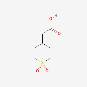 (1,1-Dioxidotetrahydro-2H-thiopyran-4-yl)acetic acid (CAS: 1224869-02-6) is a sulfone-containing carboxylic acid derivative with the molecular formula C₇H₁₂O₄S and a molecular weight of 192.23 g/mol . Its structure features a tetrahydrothiopyran ring system oxidized to a 1,1-dioxide (sulfone) at the sulfur atom, with an acetic acid substituent at the 4-position. This compound is utilized as a building block in organic synthesis, particularly in pharmaceutical and peptide chemistry, due to its reactive carboxylic acid group and the conformational rigidity imparted by the sulfone-modified thiopyran ring .