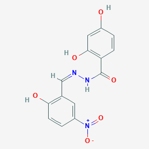 The mechanism of action of 2,4-dihydroxy-N’-(2-hydroxy-5-nitrobenzylidene)benzohydrazide involves its interaction with various molecular targets. The hydroxyl and nitro groups allow it to participate in redox reactions, which can modulate biological pathways. For example, its antioxidant activity is attributed to its ability to scavenge free radicals and reduce oxidative stress .
