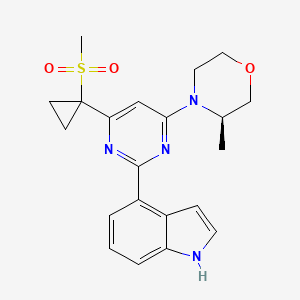 The synthesis of (3R)-4-(2-(1H-indol-4-yl)-6-(1-methylsulfonylcyclopropyl)pyrimidin-4-yl)-3-methylmorpholine (this compound) involves a multi-step process. The core pyrimidine structure is assembled, followed by the introduction of the indole and morpholine moieties.