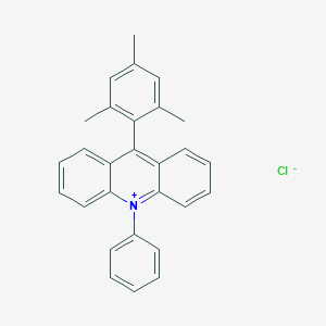 The mechanism of action of 9-Mesityl-10-phenylacridin-10-ium chloride involves its strong fluorescent and redox properties. It acts as a fluorescent probe by emitting light upon excitation, making it useful in various analytical applications. The compound’s redox potential allows it to participate in electron transfer reactions, which are crucial in many chemical and biological processes .