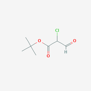 Tert-butyl 2-chloro-3-oxopropanoate is a specialized ester derivative featuring a tert-butyl group, a chlorine substituent, and a ketone moiety. This compound is primarily utilized in organic synthesis as a reactive intermediate, particularly in the construction of heterocyclic frameworks such as imidazo[1,2-a]pyridines . Its molecular structure combines electrophilic (chlorine, ketone) and protective (tert-butyl ester) features, making it valuable in multi-step synthetic protocols.