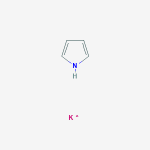 Potassium pyrrole (C₄H₄NK), also known as potassium pyrrolide, is the deprotonated salt of pyrrole (C₄H₅N), a five-membered aromatic heterocycle containing one nitrogen atom. The compound is synthesized by reacting pyrrole with a strong base like potassium hydroxide (KOH), replacing the N–H hydrogen with a potassium ion. This substitution enhances its nucleophilicity, making it a key intermediate in organic synthesis for alkylation, arylation, and polymerization reactions .
