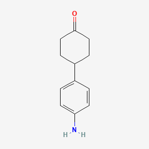 4-(4-Aminophenyl)cyclohexan-1-one is a cyclohexanone derivative featuring a para-aminophenyl substituent at the 4-position of the cyclohexane ring. This compound is widely used as an intermediate in medicinal chemistry, particularly in the synthesis of bioactive molecules targeting enzymes and receptors. Its structure combines the rigidity of the cyclohexane ring with the electron-rich aromatic amine, enabling diverse interactions in biological systems. Key applications include its role in synthesizing aromatase inhibitors and prion disease therapeutics .