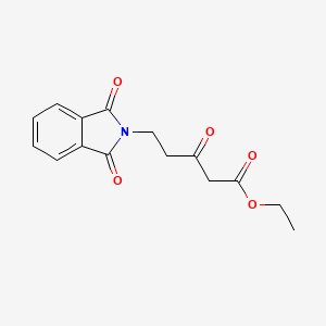Ethyl 3-oxo-5-phthalimidopentanoate is a β-keto ester derivative featuring a phthalimido substituent at the pentanoate chain's fifth position. This compound combines a reactive β-keto ester moiety with a phthalimido group, which is a cyclic imide known for its electron-withdrawing properties and role as a protecting group in organic synthesis.