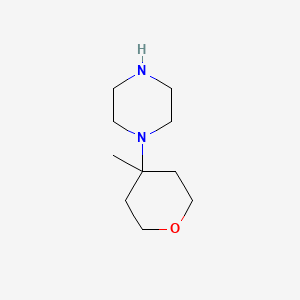 1-(4-Methyloxan-4-yl)piperazine is a piperazine derivative featuring a tetrahydropyran (oxane) ring substituted at the 4-position with a methyl group. Piperazine derivatives are widely explored for their pharmacological relevance, including anticancer, antimicrobial, and central nervous system (CNS) activities, as well as applications in materials science (e.g., adsorbents) .