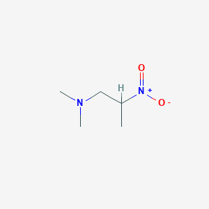 “1-Propanamine, N,N-dimethyl-2-nitro-” (CAS RN: 62689-52-5 as the hydrochloride salt) is a tertiary amine derivative of propane with a nitro group (-NO₂) at the second carbon and two methyl groups attached to the nitrogen atom. Its molecular formula is C₅H₁₂ClN₃O₂ in the hydrochloride form, with the free base likely being C₅H₁₁N₃O₂ (molecular weight ~145.16 g/mol). The compound’s structure comprises a propane backbone where the amine group at position 1 is substituted with two methyl groups, and the nitro group is positioned at carbon 2. This structural configuration influences its physicochemical properties, such as polarity, solubility, and reactivity .