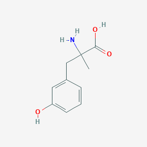 The synthesis of α-methyl-m-tyrosine (DL-form) involves condensation reactions using precursors like substituted benzaldehydes and hydantoin derivatives, followed by hydrolysis and resolution. Stein et al. (1955) described its preparation via catalytic hydrogenation and crystallization from methanol (dec. 296–297°C) . Characterization typically employs high-performance liquid chromatography (HPLC), nuclear magnetic resonance (NMR), and mass spectrometry (MS) to confirm molecular identity (C₁₀H₁₃NO₃; MW 195.22) and purity ≥98% .